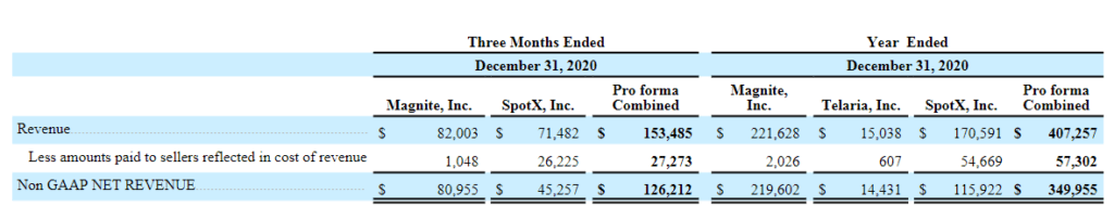 - Combined pro forma non-GAAP net revenue includes (i) preliminary unaudited non-GAAP net revenue for SpotX for 2020 or Q4, as applicable; (ii) preliminary unaudited non-GAAP net revenue for Magnite for 2020 or Q4, as applicable; and (iii) with respect to full year 2020, Telaria’s unaudited non-GAAP net revenue for Q1 2020 (since the Telaria merger closed on April 1, 2020, and therefore Telaria Q1 2020 results are not represented in Magnite’s full year 2020 reported results).