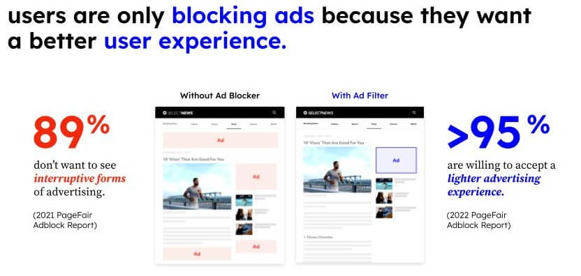 It’s important to note that ‘ad blocking’ no longer means what it used to, as most ad blockers on the market integrate some form of ad filtering. Over 300 million of those ad-filtering users understand how advertising helps keep the internet free to use and are willing to view a “filtered” ad experience with noninvasive ads – and they don’t hate all ads – just the intrusive and excessive ones (2023 eyeo Ad-Filtering Report, Jan 2024). Catering to these users is important because it’s a middle ground that respects and recognizes their online preferences, as well as their privacy demands, which helps publishers gain incremental revenue in return.