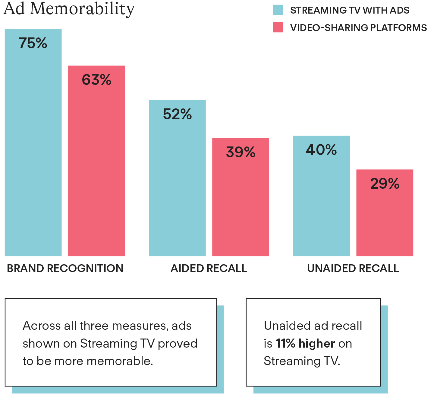 Streaming TV delivers stronger ad recall than Video-Sharing Platforms.