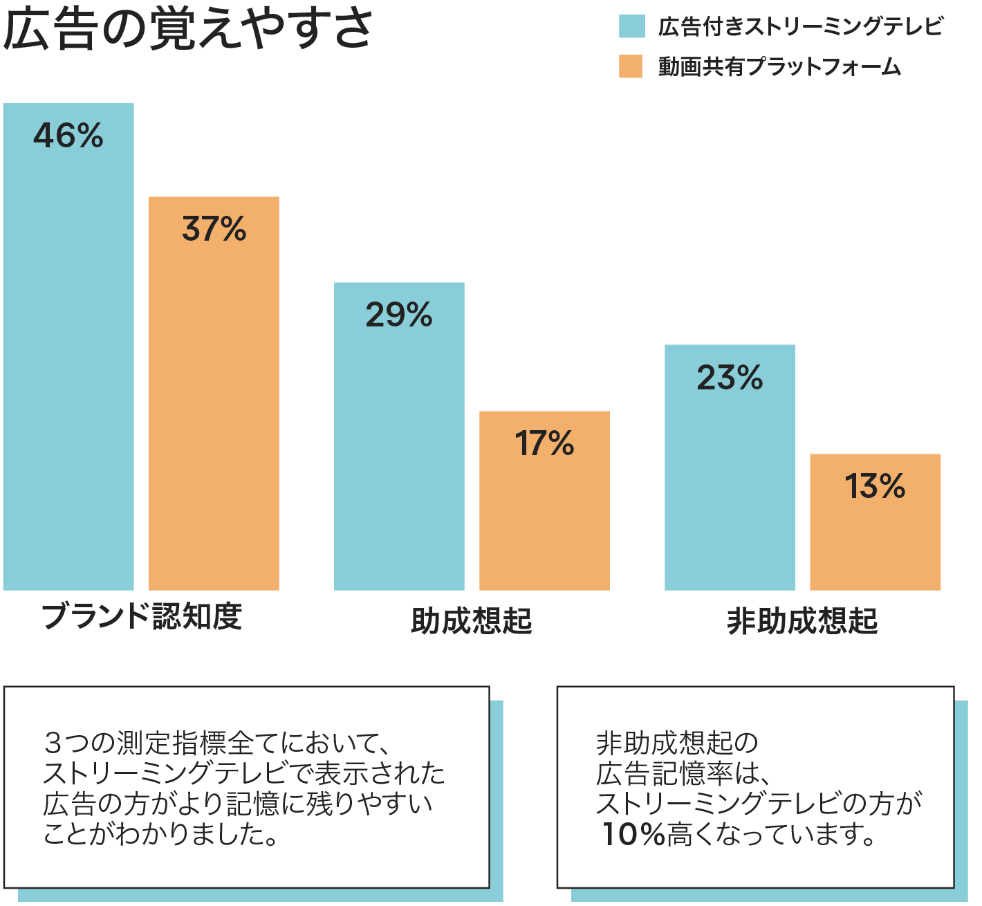 ストリーミングテレビは動画共有プラットフォームよりも広告想起率が高くなっています。