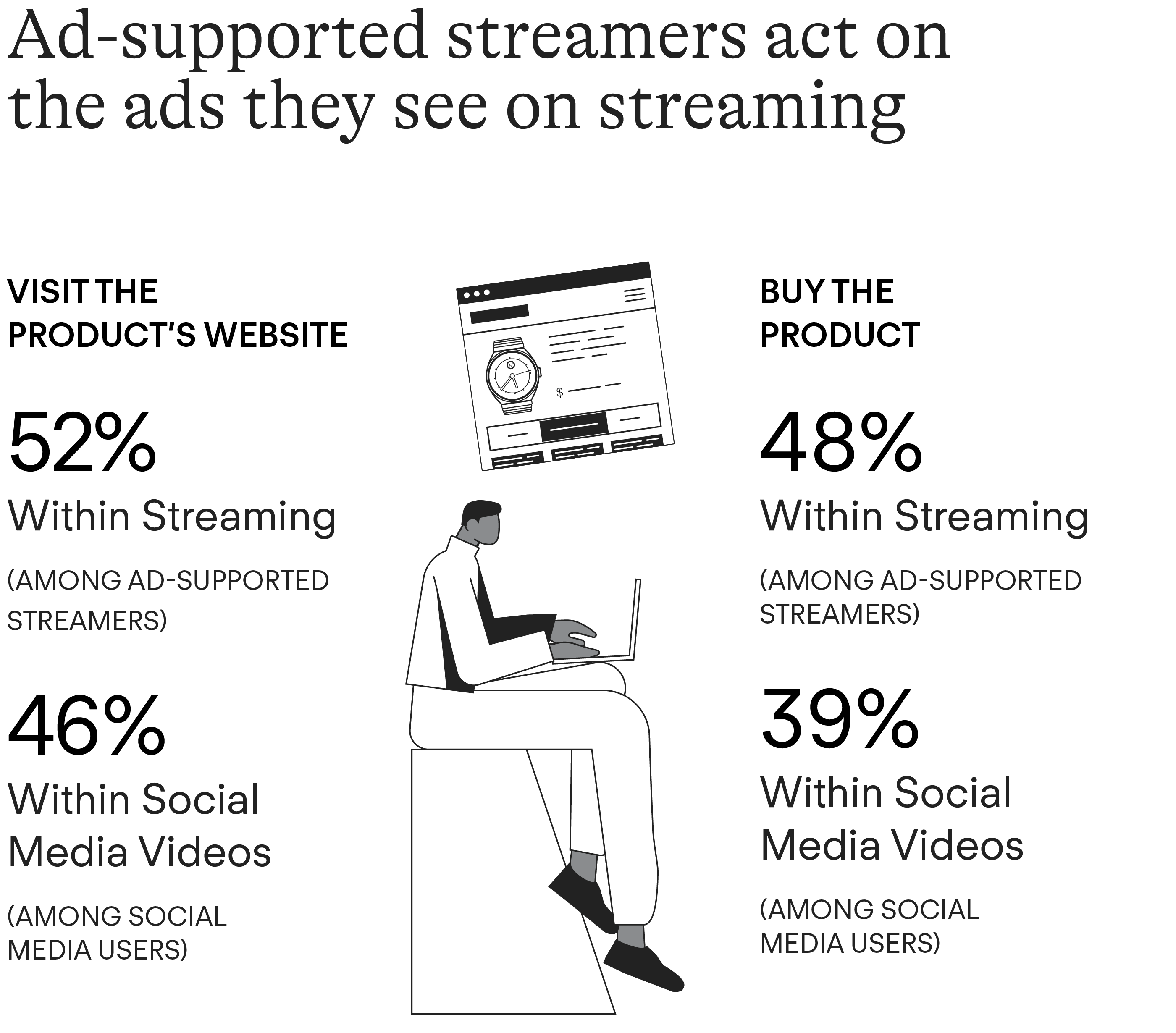 Streaming’s premium environment delivers impact to brands. 90% of ad-supported streamers said they have discovered new products and services as a result of seeing ads on streaming platforms and 68% took action. Streaming services also outperform videos on social media at different stages of the purchase journey.